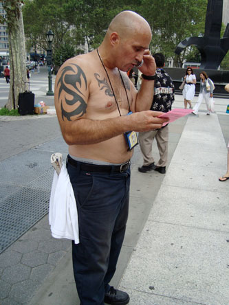 On July 31 members of CodePink NYC, the Granny Peace Brigade and the American Friends Service Committee held a tripartite demonstration in Foley Square, NYC. The AFSC brought material on the cost of war. The Granny Peace Brigade brought the Phone-A-Thon kit with flyers about H. Con. Res. 362* – the resolution gearing up for war on Iran. (Does anyone know who wrote H. CON. RES. 362? Not who sponsored it, but who wrote it which might not be the same person.)
