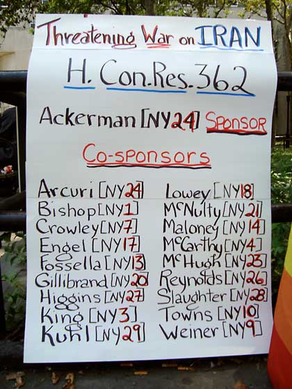 We hold phone-a-thons in various gathering places throughout NYC, helping people contact their representatives by phone to express their opinions about what’s going on in Congress. We’ve been focusing lately on what we call the “wall of shame”, the list of 20 New York State Congressional Representatives who signed on to Rep. Ackerman’s resolution.