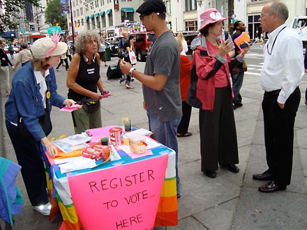 A woman on her way into the park comments, “No More Wars, I agree” then shows the button she’s wearing: “Parent US Army.”  A young woman who works with the Federation of Senior Citizens salutes us: “I’ve bookmarked your website!”  People pick up Voter Registration forms.