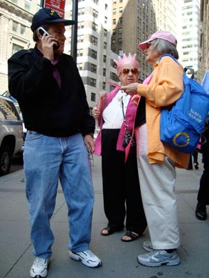 That gets everyone’s attention and before you know it, we’re out of literature. Phyllis heads off to find a Kinkos and the rest of us fan out into the crowd and start talking. We’ve got our signs, pink crowns, and Joan P is wearing her ‘march of the dead’ mask. The lunchtime crowd has no hesitation in expressing their outrage and dismay. When we tell one gentleman that the main congressional switchboard seems to be jammed, he breaks into a huge grin and says, “Well, let me just jam it up a little more!” as he starts dialing.