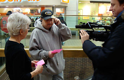 They can use our pink quarter-sheet handout with Congressional Switchboard number (202-224-3121) and name of the joint resolution for signing the Oslo Declaration and banning the use, sale and transfer of cluster bombs. It’s S.J.RES.37 & H.J.RES.91. Two soldiers, on duty, initially tell Phyllis they don’t know what a cluster bomb is. They listen to an explanation and take fliers to read. Edith senses since the election of Obama, people are readier to believe voters matter.