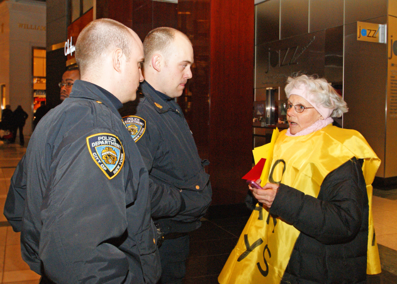 For 45 minutes the grannies belted out their ballads targeting militaristic toys, particularly those made by Hasbro. Our very own Bev was assigned to schmooze with the guards and the police as Mercy led us all in song. Mercy you can hear on the third floor of the Time-Warner Building.