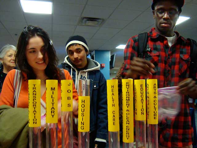 After they allot their pennies, we give voters a copy of the War Resisters League pie chart flyer – “Where Your Income Tax Money Really Goes” so they can compare their ideas to the actual Federal budget.