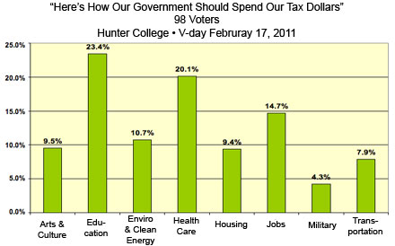 The GPB and CodePink went to Hunter College with Ms. Gizmo on V-Day and International Women’s Day. We invited students and teachers to vote their tax preferences using a package of 20 pennies as their vote. We told them to imagine they were Congresspeople distributing 20 billion dollars among our eight categories.