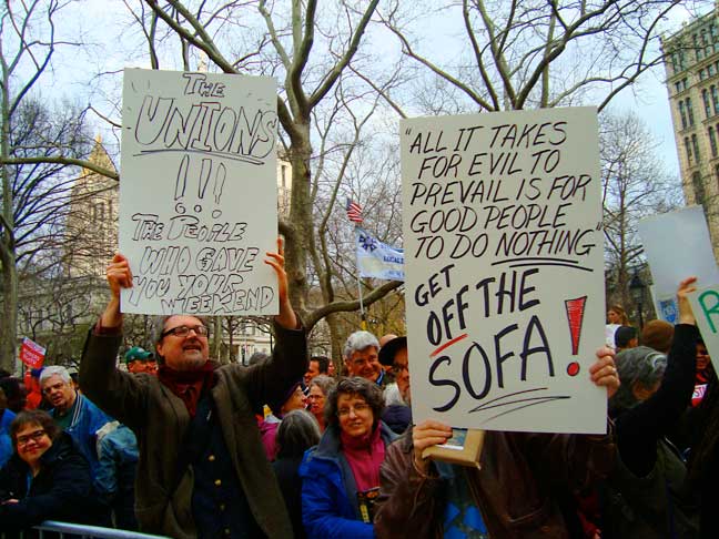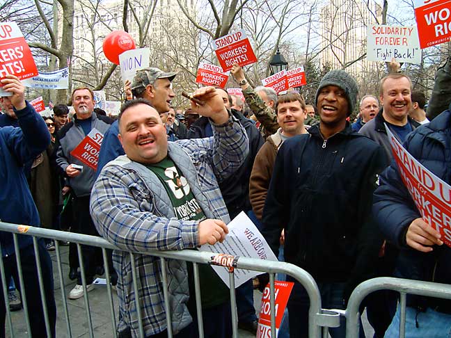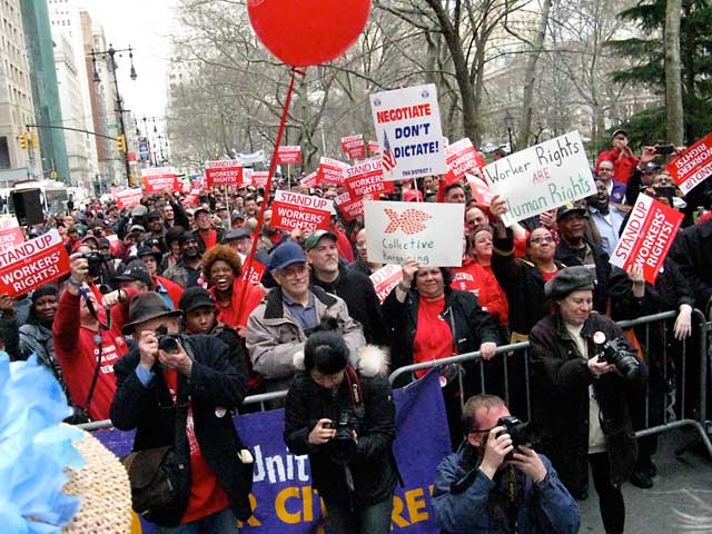 We answered the call to support Union workers and gathered at Starbucks with the Raging Grannies and others. Across Broadway a large crowd had gathered, many with red signs — Stand Up for Workers’ Rights.