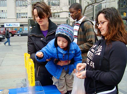We provided twenty pennies to each voter and asked them to divide the pennies among eight tubes, representing categories in the Federal Budget. “Pretend you’re a Congressman, and these are twenty billion dollars,” we told them. After they voted, we provided these active citizens with information [on the War Resisters League flyer] about where their taxes are really being spent. Education is our game and pennies and tubes are our tools.
