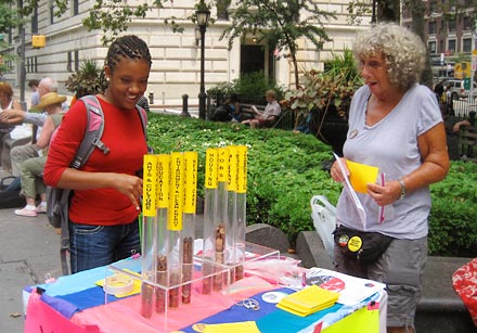 Here a participant views the War Resisters’ flyer Where Your Income Tax Money Really Goes after denoting, with our pennies, where she thinks her tax money should go.
