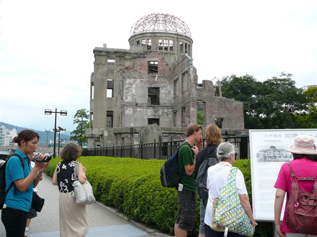 As a U.S. citizen attending this solemn, formal commemoration, the event was very painful – it was the U.S. that unleashed this horror on the world and inflicted a nightmare of destruction on the people of Japan. The Peace Park area was set with 12,000 chairs; escorts to seats done quietly with no frenzy; a program and a flower given to each person as they arrived; phalanxes of TV camera crews arrayed on the side; orchestras and choruses dressed all in white; the day was clear and hot and attendees were advised to drink water which was provided. At eight o’clock the ceremony began with a dedication of the register of names of the victims, a brief address and then foreign dignitaries presenting wreaths at the cenotaph. At 8:15 a.m. (the time when the bomb struck on August 6, 1945) a bell rang followed by silent prayer. The Mayor of Hiroshima spoke. Flocks of doves were released several times and a “Commitment to Peace” was read by the two 6th grade school children who had written it…their high voices sounding open and hopeful. A Peace Song was sung and the ceremony closed. We were invited to lay flowers at the monument where banks of Chrysanthemums had already been arranged.