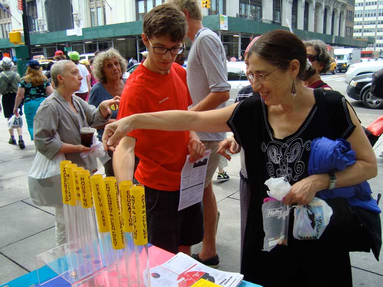 In the space of 75 minutes 94 people crowded around the GPB table to drop pennies in Mz Gizmo and list their priorities. A group on a Scavenger Hunt looking for Activists” were lucky to find us and then used their pennies to “speak their minds.” Enthusiastic participants thanked us for giving them this tool.