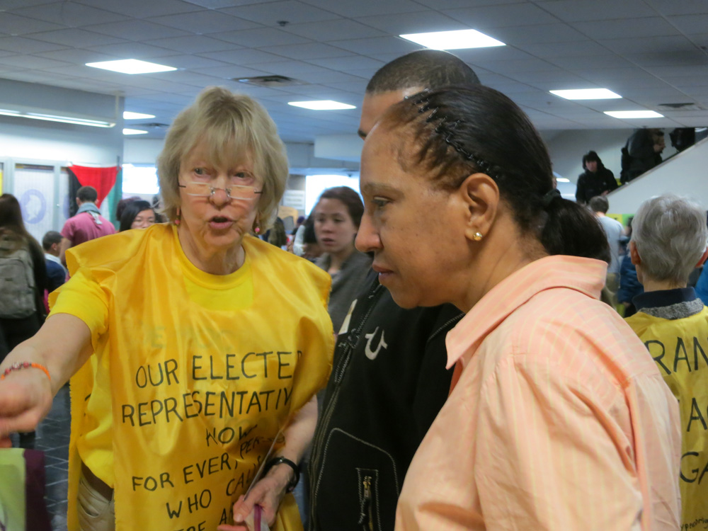 Seven Granny Peace Brigade members accepted the invitation of Hunter College’s Democracy Fair organizers and prepared an educational exhibit about drones, which are unmanned airborne vehicles.  Drones can be peaceful, or they can be deadly.  They can also invade privacy and contribute to severe stress when they hover over homes.  In Pakistan, Yemen and Afghanistan, drones have killed the innocent along with suspected guilty persons; but no judge or jury had determined guilt before the execution was carried out.  The GPB re-purposed the Gizmo tubes used for our Penny Poll to poll opinions of people at the Democracy Fair about drones.