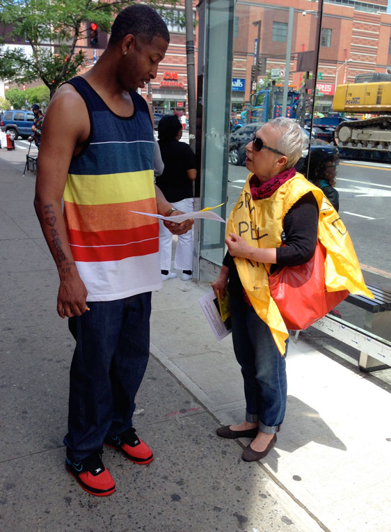 We were back at our usual spot in front of the Recruiting Station on Lennox Ave/125th St. sharing information on the latest drone news that can affect NYC residents: the recent statements by Police Commissioner Bill Bratton who said “I’m supportive of the concept of drones, not only for the police but for public safety in general.” He is quoted as also saying: “The Mayor is supportive of it as are many members of the Council…” Is this why there were at least 10 officers at different times during our 1.5 hour action hovering around us; ensuring we did not block the entrance to the Recruiting station; forcing us to remove our posters from the wall? And what about the cameras on the back of the police car, parked in front of us….blocking the bus stops….just for us!? (Click on Photos for larger images.)