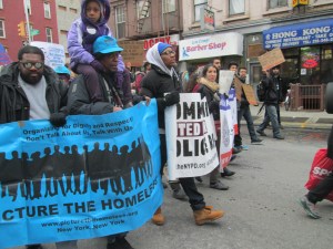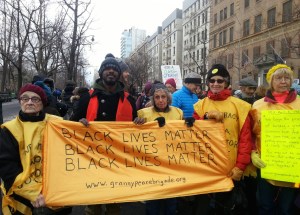 On this chilly 19 Jan 2015 Dr. Martin Luther King Jr Day, the Granny Peace Brigade provided a line of yellow banners and schmattes as we marched amidst a wide range of groups and young and old alike from 110th and Lenox to the United Nations, about 4 miles away.