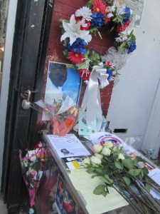 Today’s memorial at the site of the murder had a somber tone. Eleven white roses, one for each time Eric cried “I can’t breathe,” were laid one upon another, with the crowd repeating his cry for life. Nydia placed one of these on behalf of the Grannies. Yes, there was anger expressed. Disappointment. Chants for justice for Eric Garner and all the black lives being lost to police violence. Concern for Ramsey Orta, a hero for sharing the video of the event, knowing how this could adversely affect his life.
