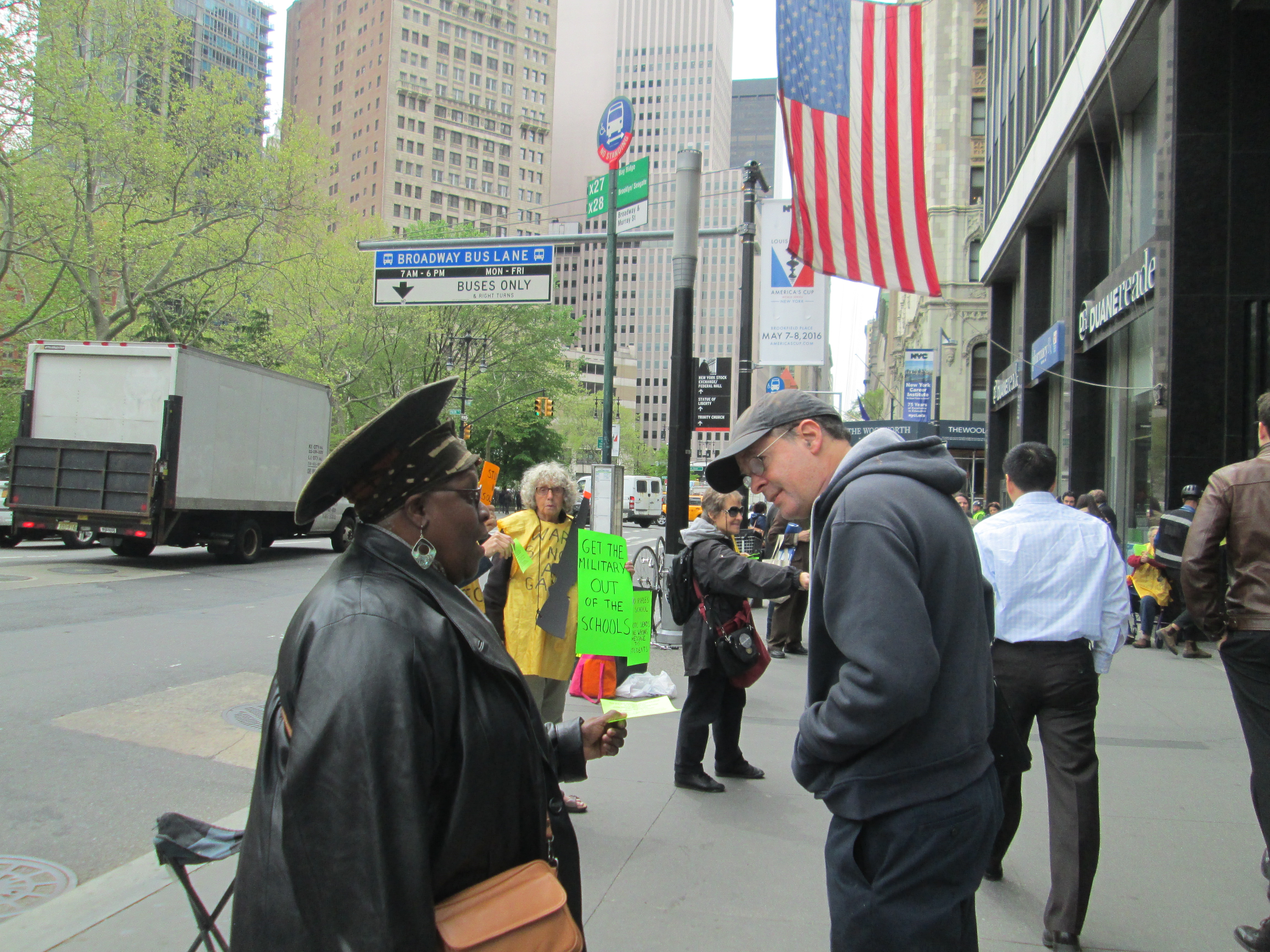The Granny Peace Brigade, with support from the Peace Action, was at City Hall for the third time this year (2016) demanding that funding for the Junior Reserve Officers training Corps (JROTC) program, in 18 NYC high schools, not be approved. The Mayor’s Education Expense Budget, 2016-2017, includes an estimated $1.5 million for JROTC – a misuse of our tax dollars for a military program. JROTC classes take the place of regular classes for those students who participate.