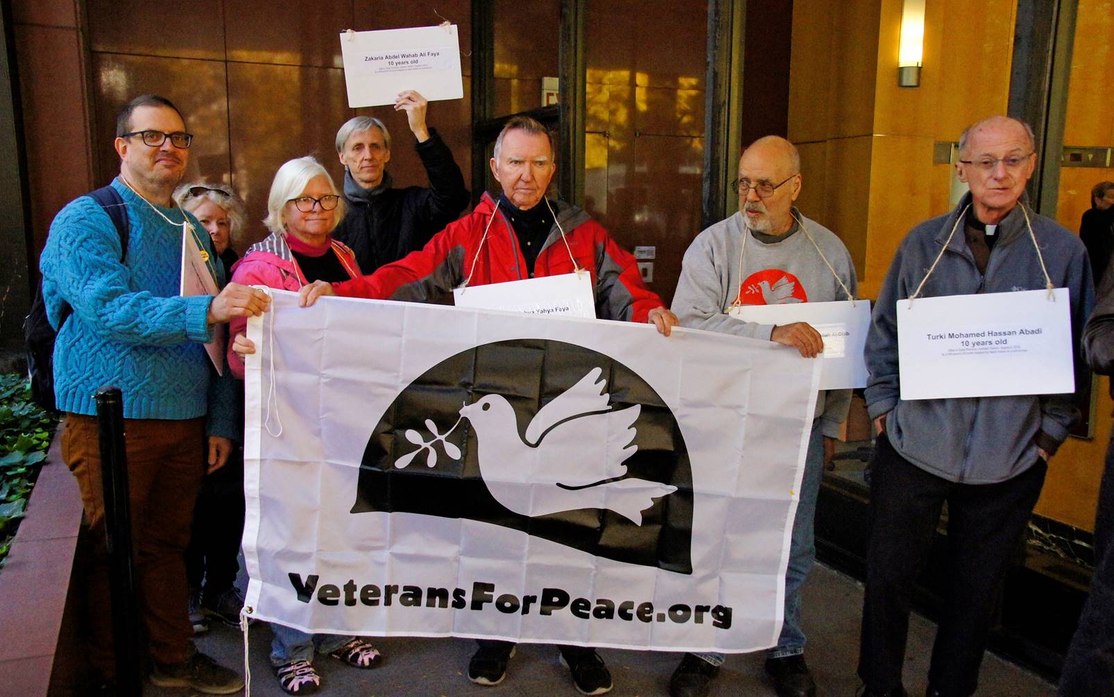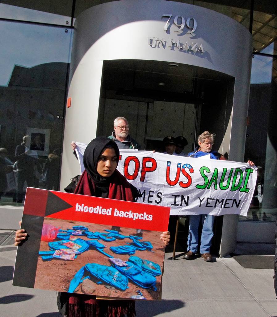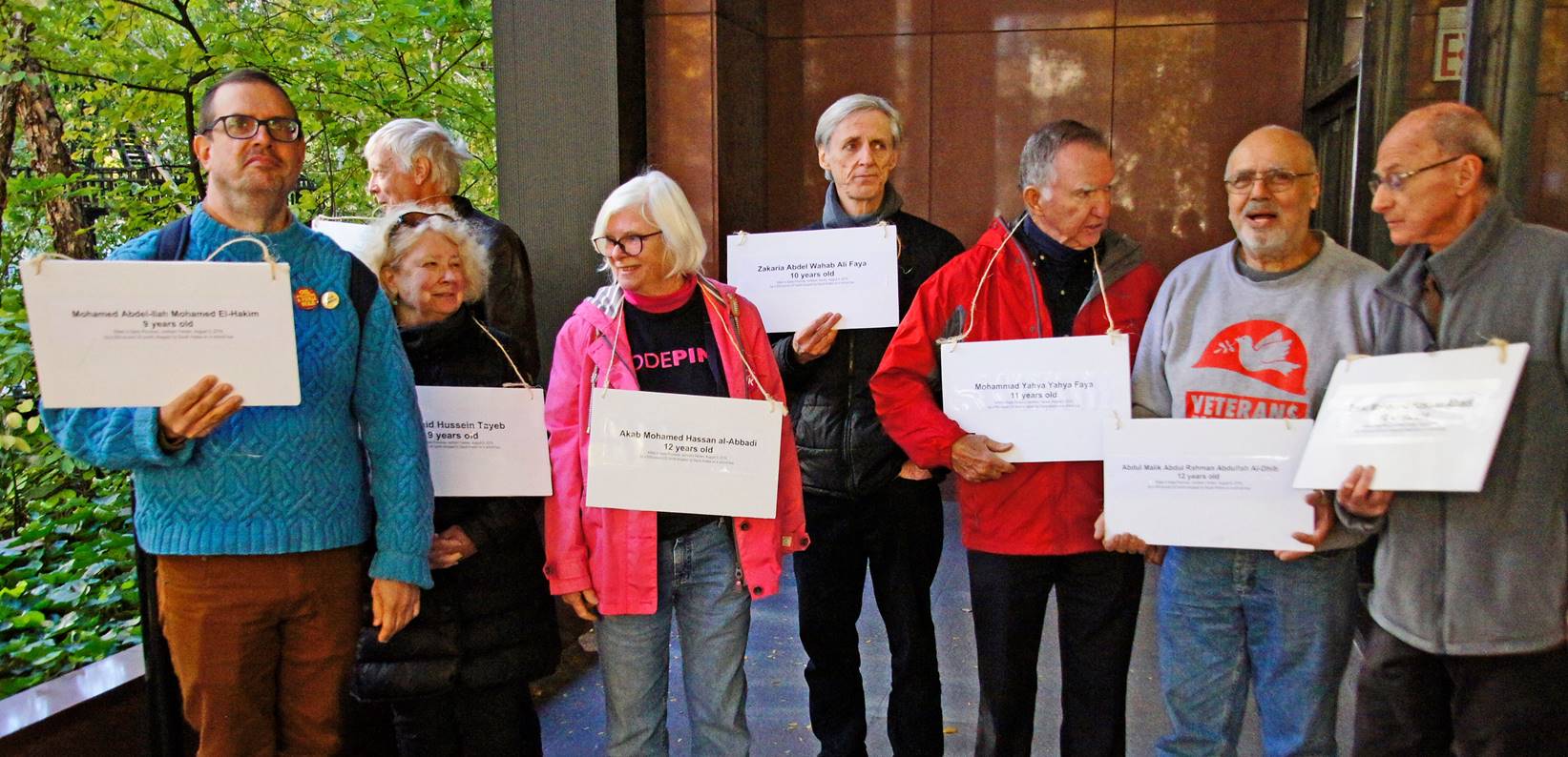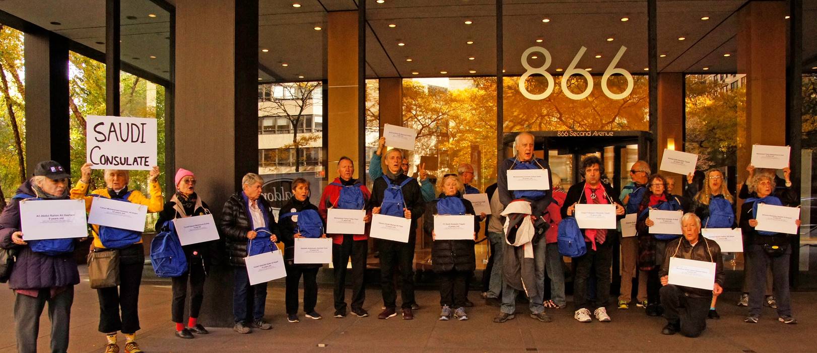 Kathy Kelly from Voices of Creative Nonviolence called for three days of protests at the United Nations and the U.S. and Saudi Missions, as well as the Saudi Consulate. The Granny Peace Brigade joined Catholic Workers, Veterans for Peace, War Resisters League, Peace Action, Code Pink, Know Drones, Grafton Peace Pagoda and others.