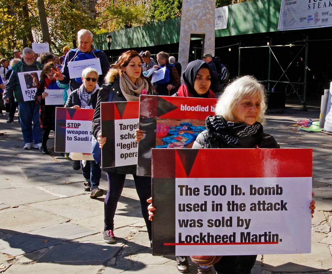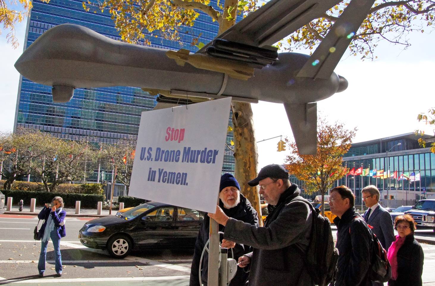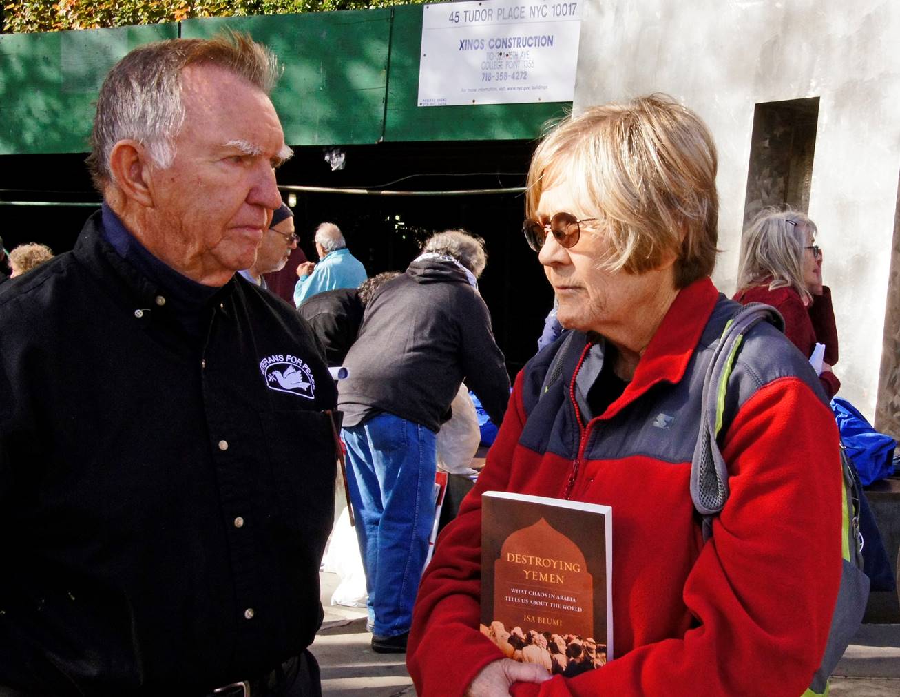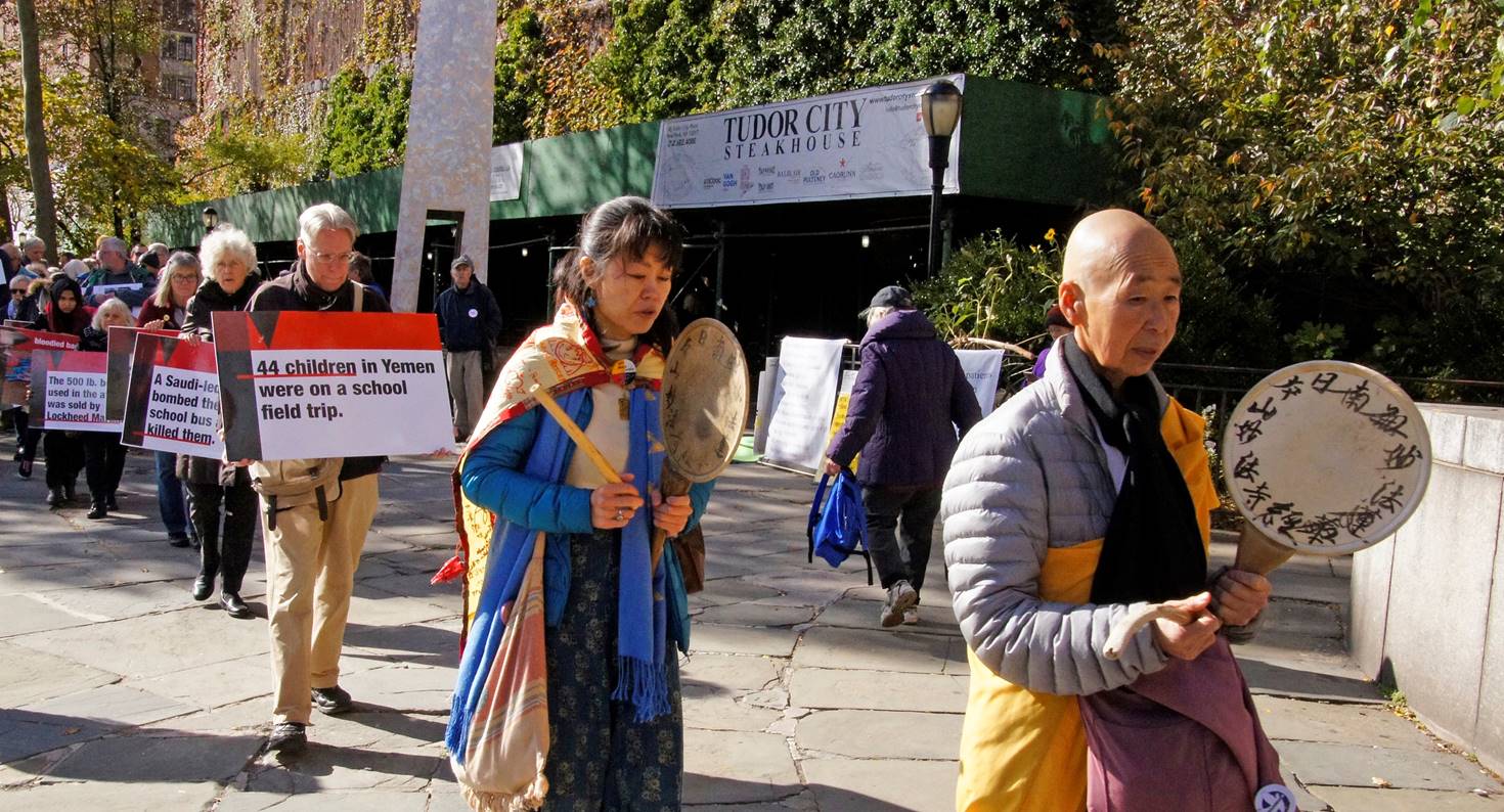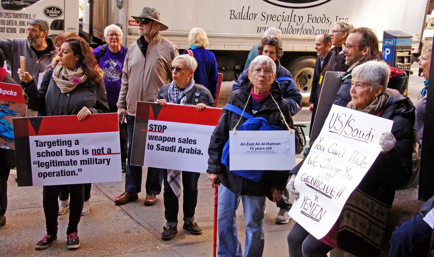 Kathy Kelly from Voices of Creative Nonviolence called for three days of protests at the United Nations and the U.S. and Saudi Missions, as well as the Saudi Consulate. The Granny Peace Brigade joined Catholic Workers, Veterans for Peace, War Resisters League, Peace Action, Code Pink, Know Drones, Grafton Peace Pagoda and others.