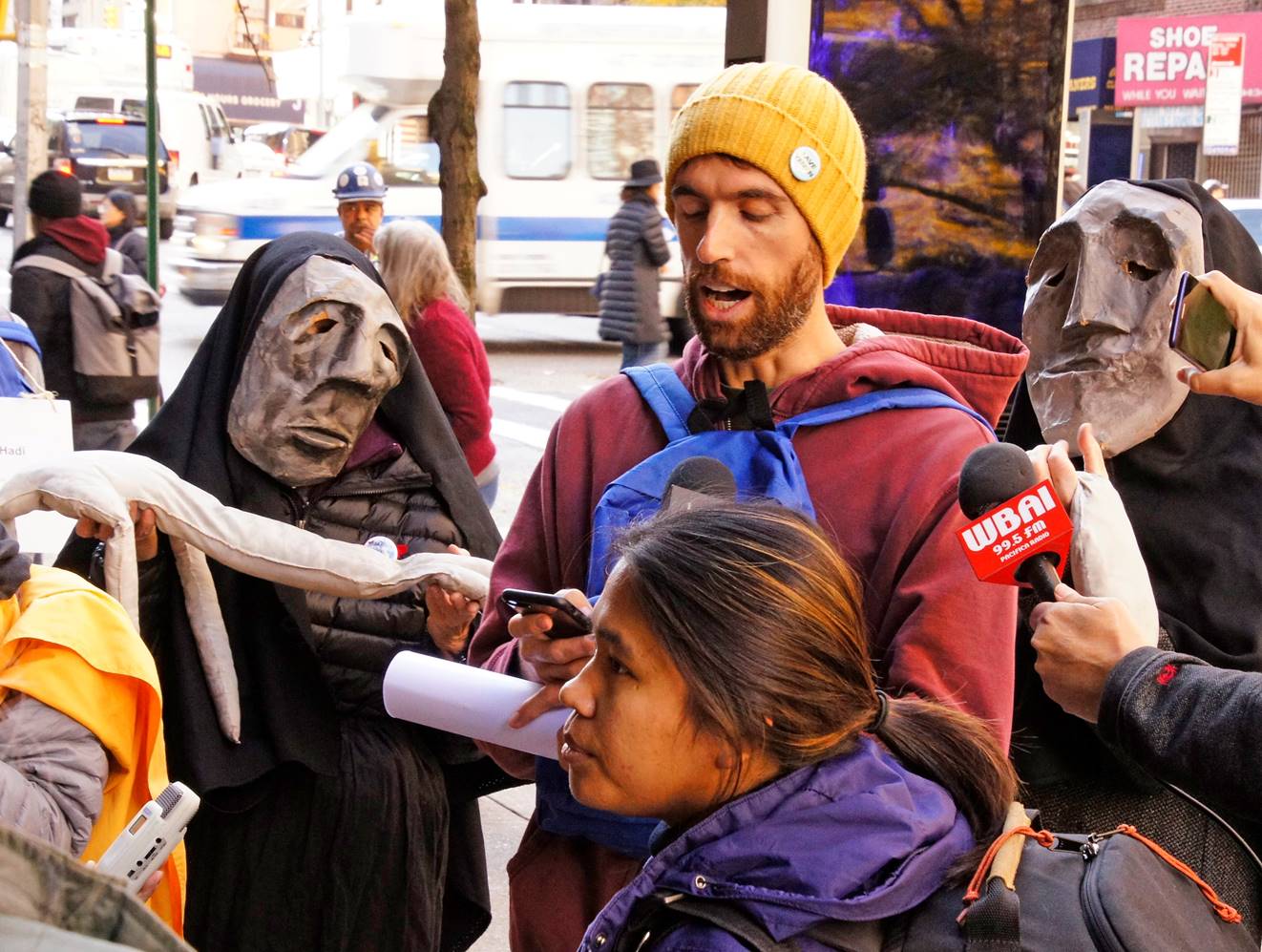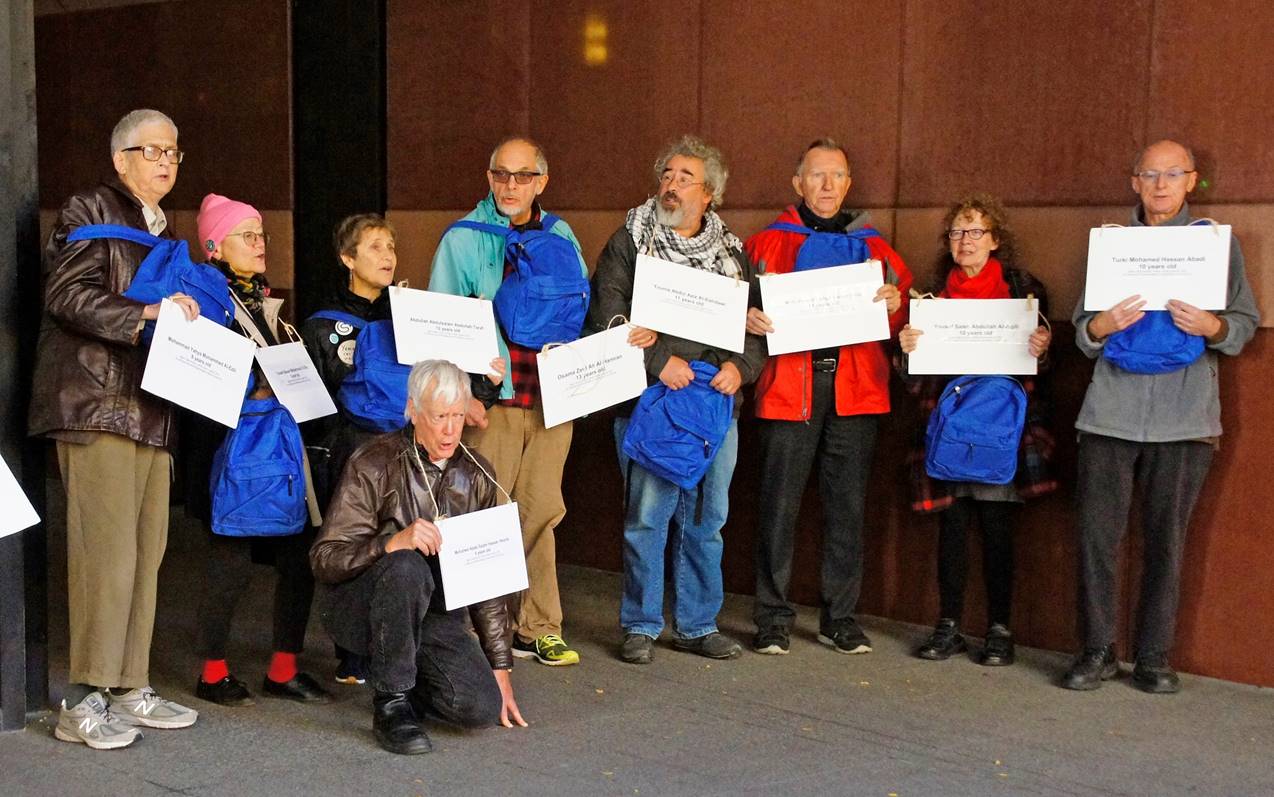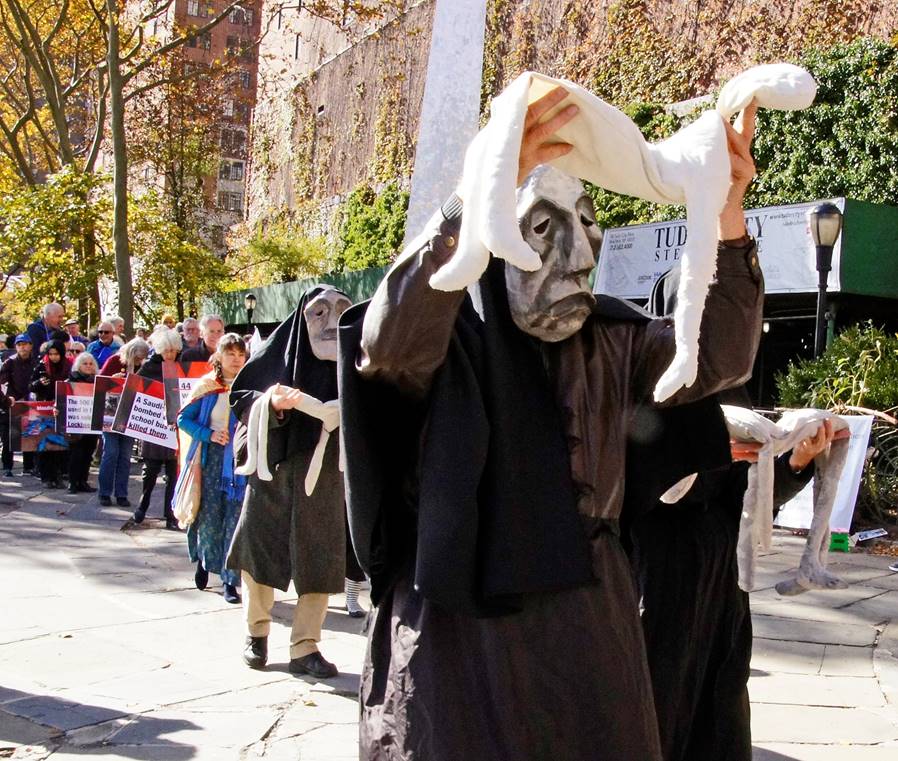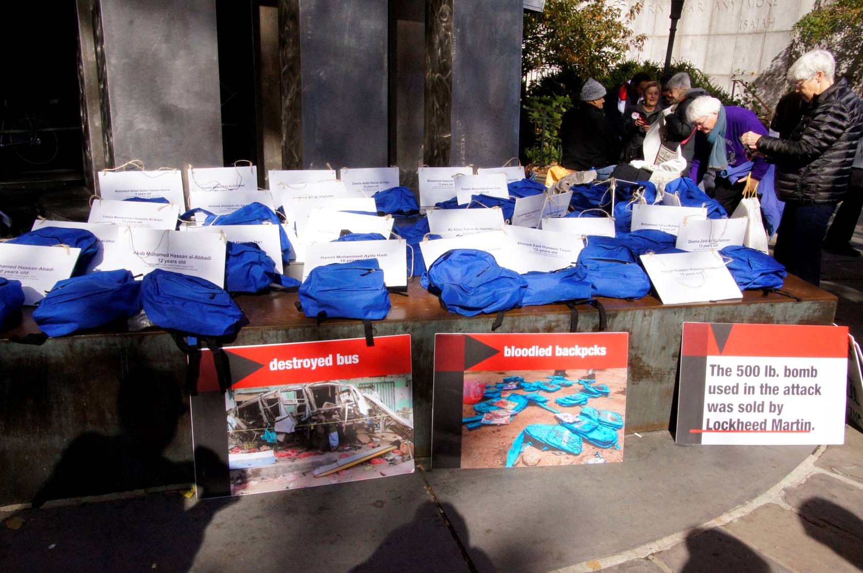 On the third day, Thursday, November 8th our group of 60-70 gathered at the Isaiah Wall on First Avenue and 43rd Street (“…they shall beat their swords into plowshares, and their spears into pruninghooks: nation shall not lift up sword against nation, neither shall they learn war any more.”). The solemn single file procession was led by anti-nuclear activist Jun-san Yasuda and Ayumi Temlock. Following were activists portraying Grieving Mothers holding children’s bodies, signs explaining to onlookers what we were commemorating. Nick Mottern’s mock drone accompanied us along First Avenue, past the U.S. Mission where two persons blocked the entrance, and on to 47th Street and Dag Hammarskjold Plaza, ending at Second Avenue, at the Saudi Consulate. There 25+ persons with blue backpacks for the dead school children risked arrest by blocking the entrances in an act of civil disobedience. The names were recited of the 44 Yemeni children killed in their school bus August 9th. The action ended with the NYPD informing everyone they would not be arrested, nor were the protesters at the U.S. mission. The horror of this religious-civil-tribal-resource war is such that no country wishes to draw attention to its role in it.