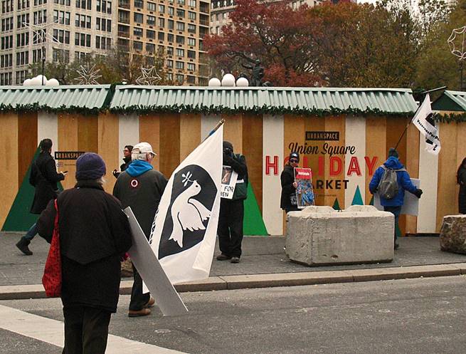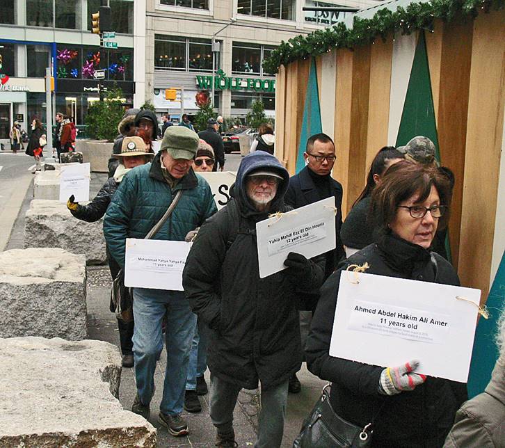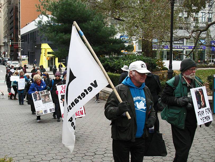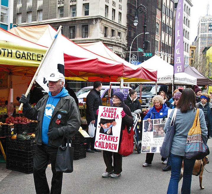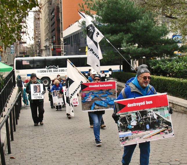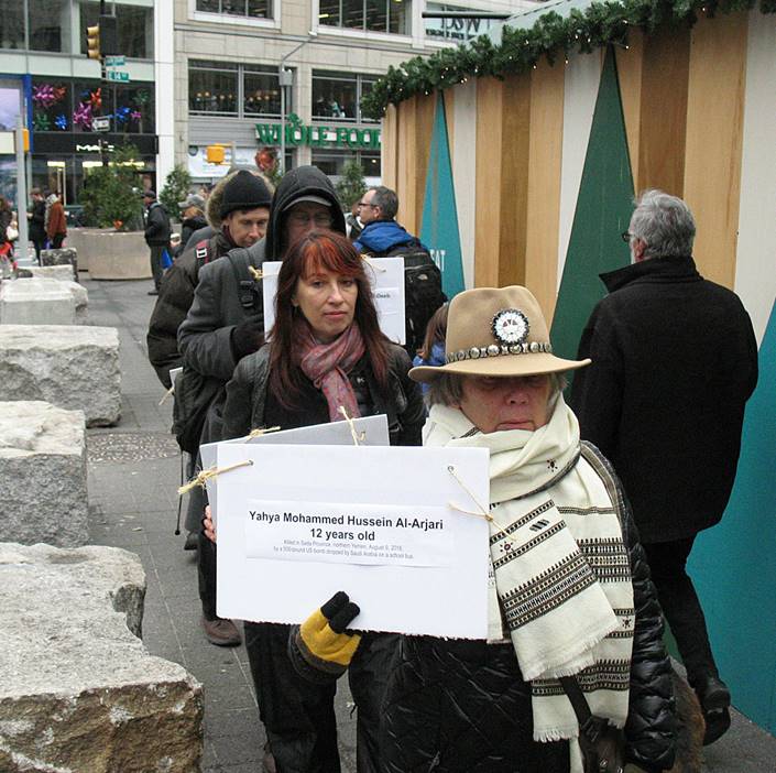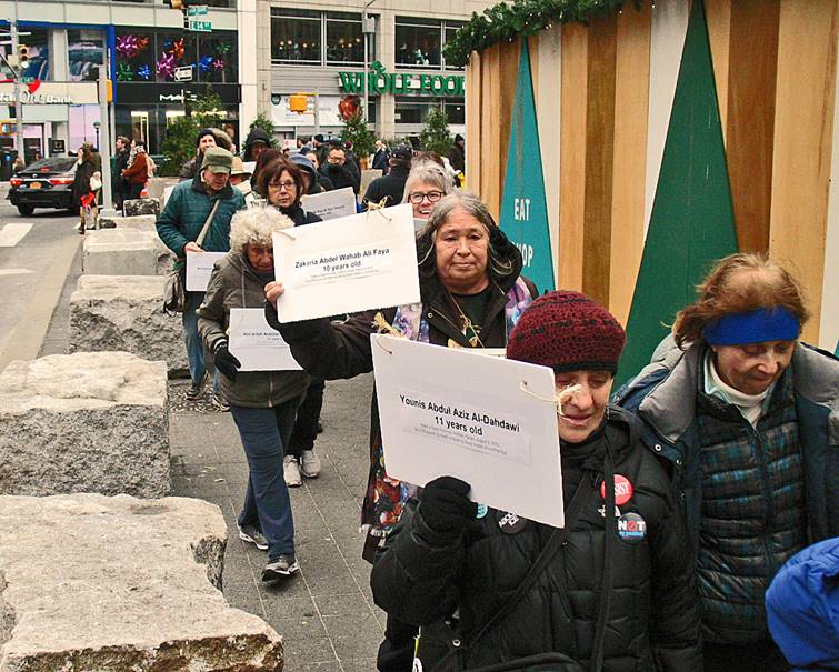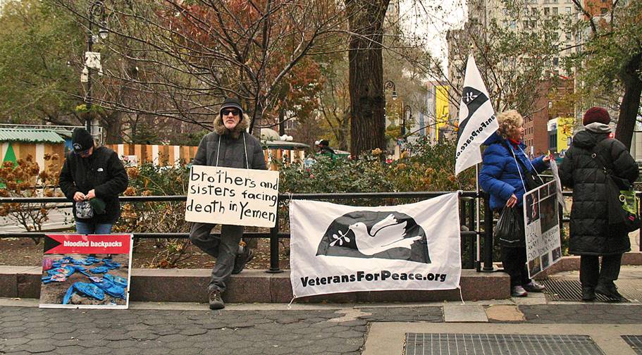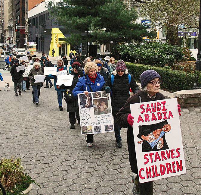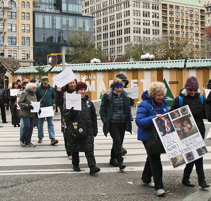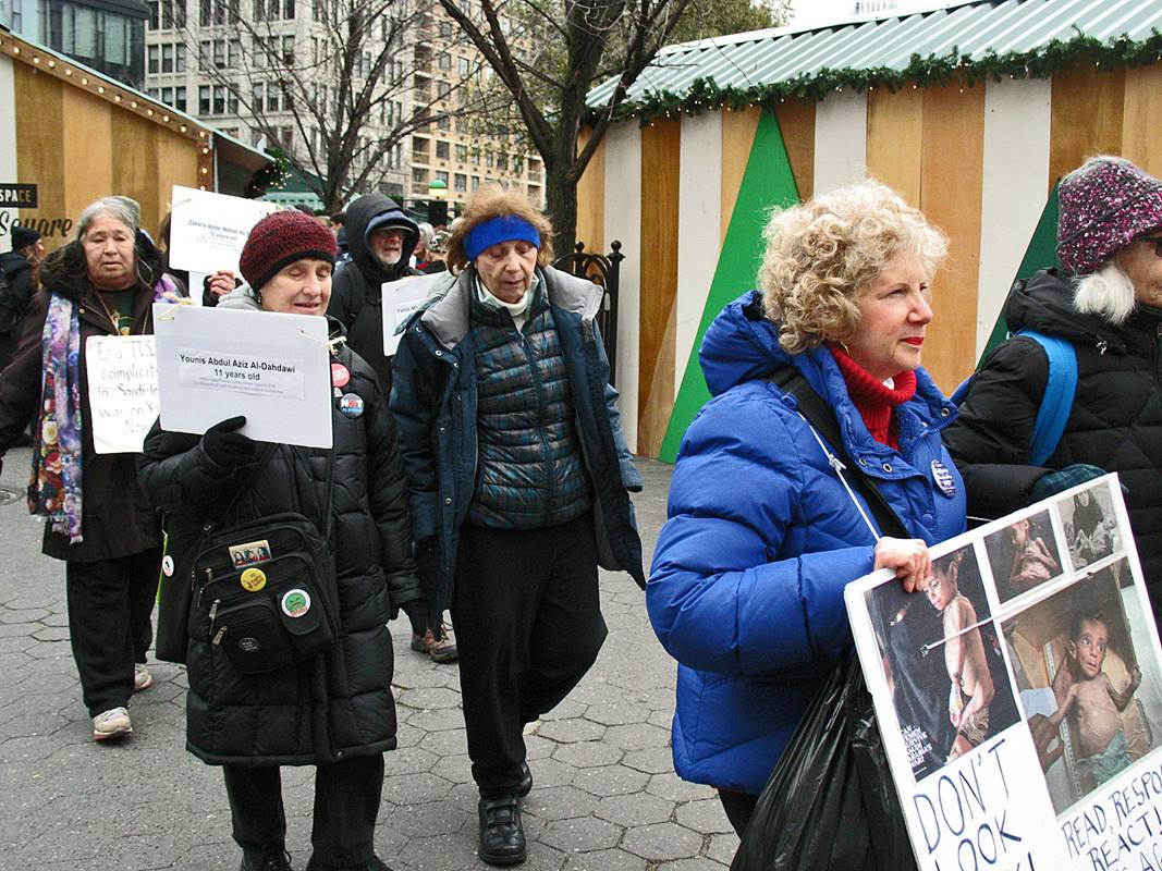 Members of the Granny Peace Brigade participated in the weekly vigil for peace in Yemen, in Union Square on Saturday, November 24th. The weekly vigil was initiated by the Catholic Worker one and a half years ago. Several members of other peace organizations take part in this endeavor.