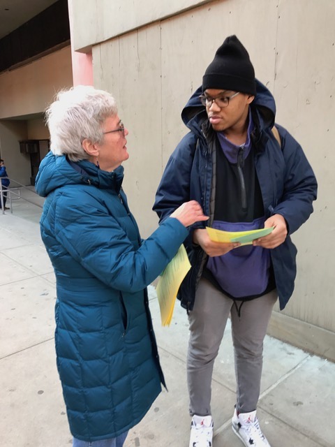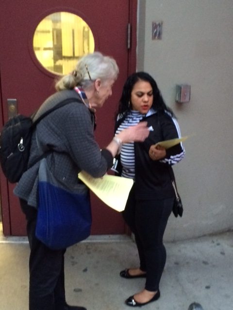 On Parent-Teacher Conference night parents have the opportunity to meet with their child’s teacher to discuss her his progress in the class. It is also an opportunity for volunteers to distribute educational informational flyers to parents. The informational flyers address Options for Life After HS as well as Questions to Ask Military Recruiters. In spite of the cold & wind that evening, volunteers were at 12 high schools throughout the 5 boroughs and distributed approximately 2,400 flyers.