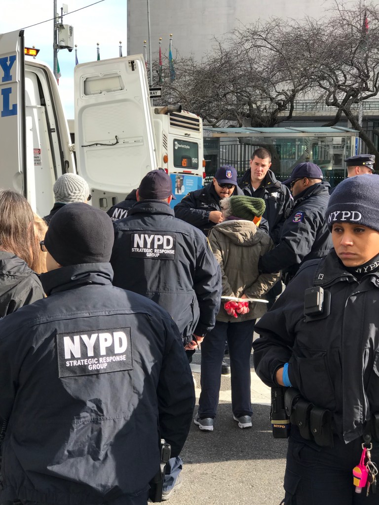 The demonstrators gathered at the US Mission, peacefully blocking the doors. Almost immediately the police broadcast a prerecorded arrest warning. One officer very obviously took surveillance videos. The recording sounded a bit like Steven Hawking’s voice machine or like George Orwell’s Big Brother. It sounded like it was designed to intimidate. And since the NYPD is capable of surreptitiously taking photos and videos, our best guess is the police officer with the little camera was sending us a message first, and collecting information second.
