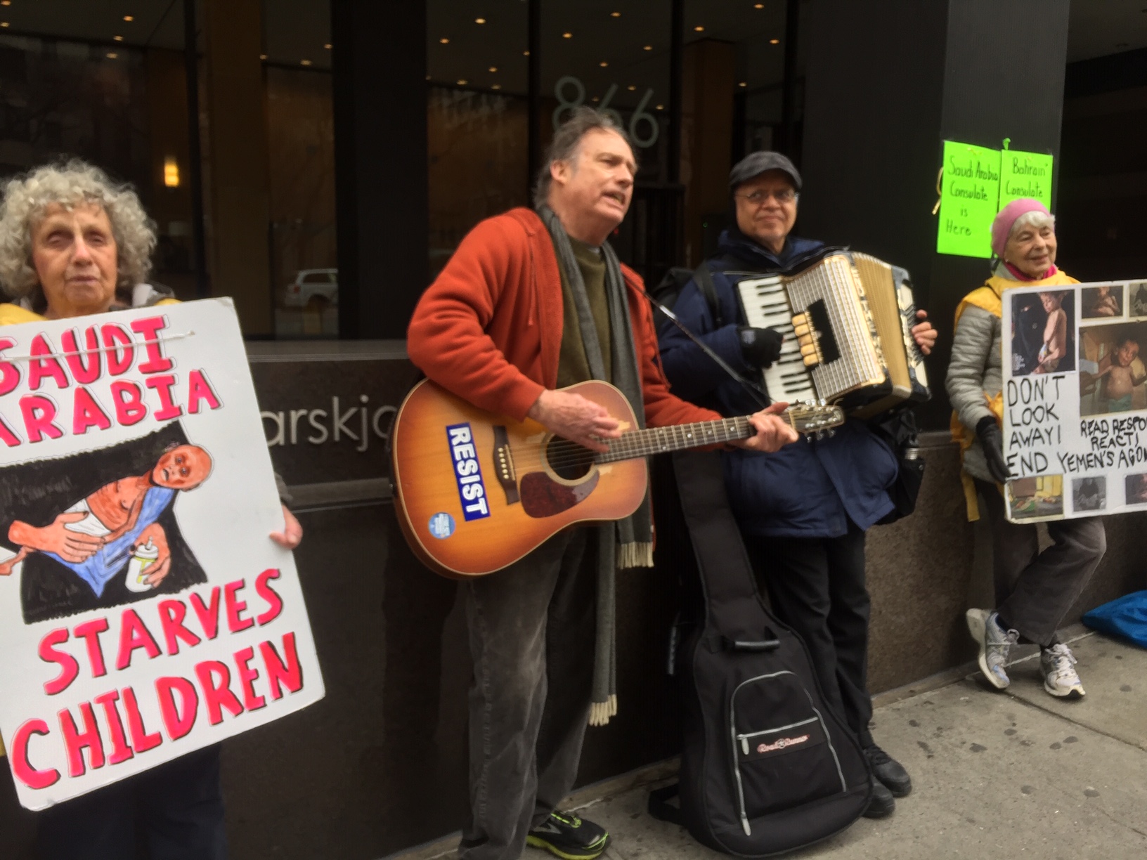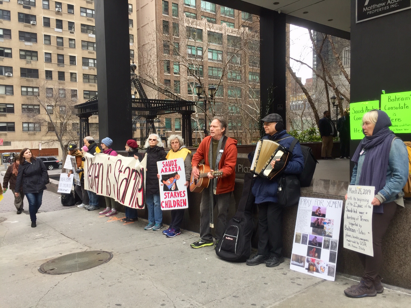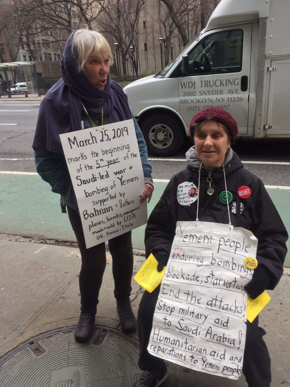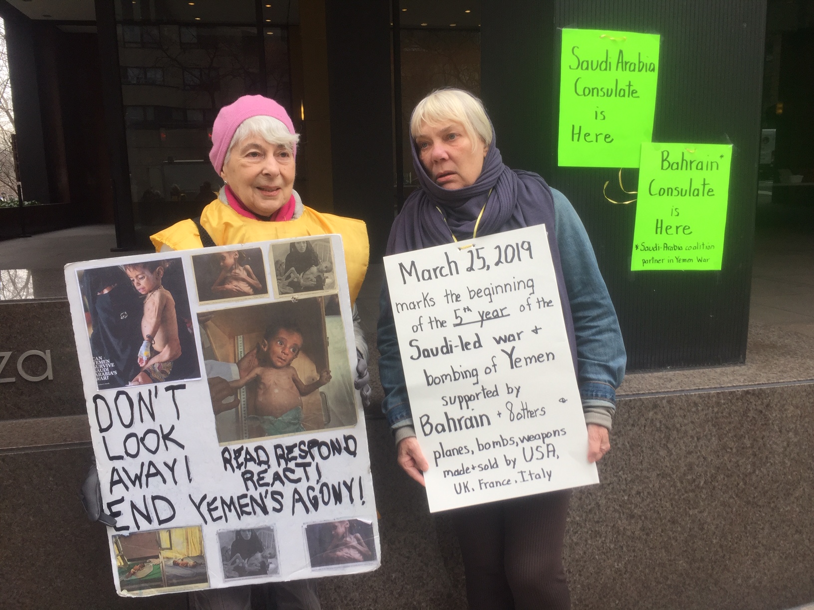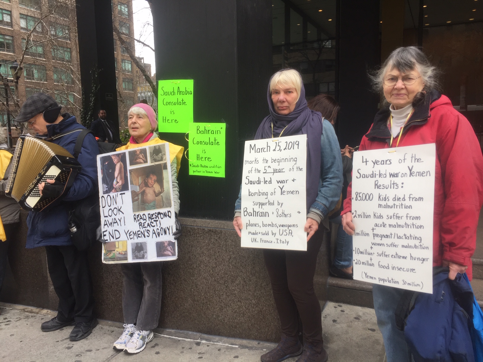 March 25, 2019 marked the beginning of the 5th year of the Saudi-led war on Yemen. The Granny Peace Brigade, together with friends including some from the Saturday Catholic Worker vigil for Yemen, gathered outside the NY Consulates of Saudi Arabia and Bahrain, one of the coalition partners of the Saudis in their war on Yemen, to call for an end to the the horrific war and to call upon the USA to end its support to the Saudis in this war which has been called an unconstitutional war by our Congress.