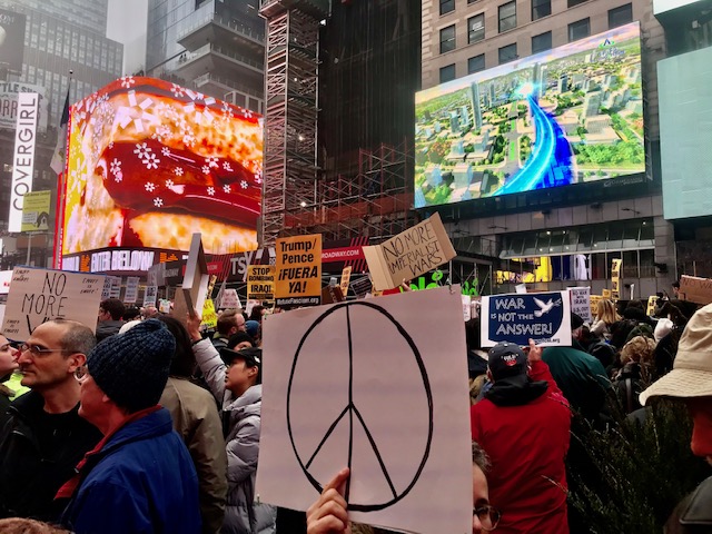 Activists from diverse organizations merged at Times Square (a “designated activity zone”) speaking out against Trump’s misguided, dangerous, war actions. The weekend of rallies began today to protest the US assassination of Iran’s General Suleiman. Peace activists were out in force and it signals the start of a year brimming with resistance.